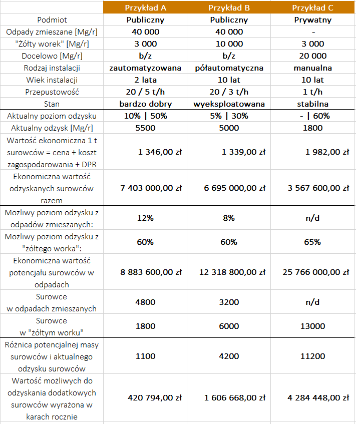 Instalacja A wyposażona jest w zautomatyzowaną linię sortowniczą, której stan techniczny oceniany jest jako bardzo dobry. Jest to instalacja publiczna, a strumień dostarczanych odpadów jest stabilny. Patrząc na liczby przedstawiające sytuację tej instalacji, to pierwsze wrażenie może być takie, że aktualny poziom odzysku frakcji surowcowych nie odbiega bardzo od potencjalnego odzysku surowców, które zawarte są w odpadach. Przy założeniu stałych cen, różnica ekonomicznej wartości potencjału frakcji surowcowych w stosunku do aktualnej wartości ekonomicznej odzyskiwanych surowców wynosi jednak 1,4 mln zł rocznie, co z kolei daje wartość 14 mln w perspektywie 10 lat. Odzyskanie dodatkowych frakcji surowcowych ma również wartość ekonomiczną, którą można wyrazić w karach, jakich można uniknąć w przypadku odzyskania dodatkowej masy surowców. Wartość taka wynosi ok. 0,42 mln zł/rok. Zakres modernizacji w tym przypadku nie jest znany i nie jest znany też koszt, czy możliwość jej wykonania. Jednakże pozyskanie takich informacji pozwoliłoby określić efektywność przedsięwzięcia zarówno w aspekcie ekologicznym (poziomy odzysku), jak i ekonomicznym (przez porównanie do nakładów inwestycyjnych). Analiza taka pozwoliłaby odpowiedzieć na pytania: czy doposażenie linii jest możliwe i czy byłoby efektywne.