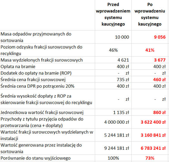 Wprowadzenie systemu kaucyjnego negatywnie oddziałuje na wszystkie czynniki, które decydują o wartości generowanej przez instalację do sortowania. Powoduje on: