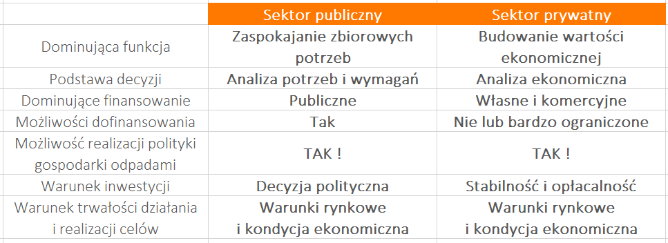 Każdy z tych sektorów, publiczny oraz prywatny, posiada swoją specyfikę. Podmioty sektora publicznego w pierwszej kolejności będą miały na uwadze zagospodarowanie odpadów wytwarzanych na określonym obszarze i tym samym zaspokajanie zbiorowych potrzeb mieszkańców w zakresie gospodarki odpadami, a w dalszej perspektywie wskaźniki ekonomiczne (bilansowanie systemu). Z kolei podmioty sektora prywatnego, poprzez zagospodarowanie odpadów, będą dążyły przede wszystkim do osiągnięcia wskaźników ekonomicznych (zysk), wypełniając zlecony im przez sektor publiczny zakres usług. Różnice między tymi sektorami wynikają z odmiennej natury obydwu rodzaju podmiotów i stanowią podstawę ekonomii dla każdego z nich. Oczywiście, będzie to miało znaczenie dla decyzji w zakresie budowy czy modernizacji sortowni odpadów. Przykładowo, jeśli podmioty publiczne będą skupiały się na danym obszarze działalności, to podmioty komercyjne będą dążyły do ekspansji rynkowej i budowania przewagi na rynku. Natomiast w interesie podmiotów publicznych niekoniecznie leży dążenie do pozyskiwania coraz większych strumieni odpadów, bo wystarczy, że zaspokoją potrzeby lokalne.