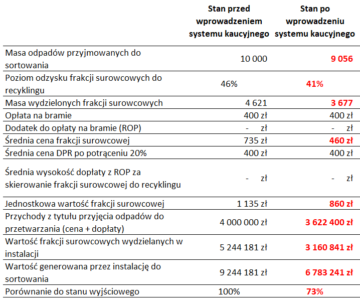 Tyle, w analizowanym przypadku, wynosi realna strata instalacji na skutek wprowadzenia systemu kaucyjnego uwzględniając w analizie stronę przychodową. Kumulatywny i tak istotny wpływ wprowadzanego systemu kaucyjnego na sytuację ekonomiczną instalacji do sortowania odpadów komunalnych wynika właśnie z tego, że oddziałuje on na każdy czynnik iloczynu decydującego o wartości generowanej przez instalację do sortowania odpadów: masę odpadów do sortowania, poziom odzysku frakcji surowcowych oraz jednostkową, uśrednioną wartość wydzielanej frakcji surowcowej.
