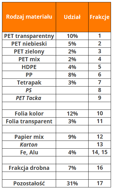 Przyjrzyjmy się przykładowej morfologii selektywnie zbieranych tworzyw przedstawionej w poniższej tabeli. Kolumna 2. przedstawia udział danego rodzaju materiału w strumieniu odpadów. Z kolei w kolumnie 3. zostały wyszczególnione produkty, na które potencjalnie warto zwrócić uwagę w procesie sortowania. Stanowią one piętnaście różnych rodzajowo materiałów, które mogą być przeznaczone do sprzedaży.